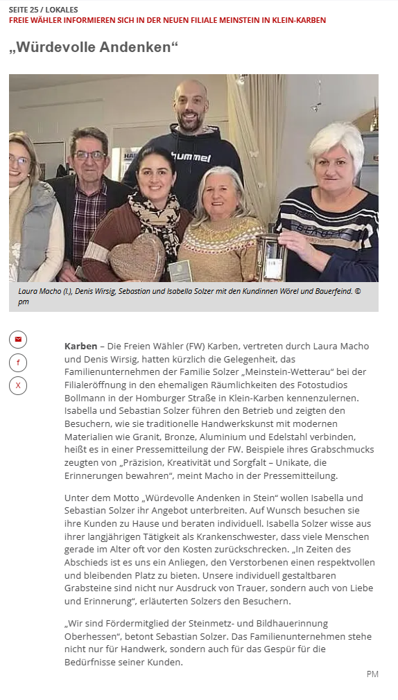 Besonders erfreulich war der Besuch hochrangiger Ehrengäste: Herr Martin Schütz, Bürgermeister von Wöllstadt, ließ es sich nicht nehmen, persönlich vorbeizuschauen und ein Grußwort zu sprechen. Ebenfalls vor Ort war Herr Martin Röhling, Obermeister der Steinmetz- und Bildhauerinnung Oberhessen, der mit Fachwissen, Erfahrung und offenen Gesprächen zum Gelingen des Tages beitrug.